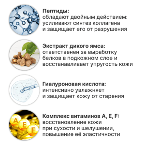 Липосентол мульти (смесь эфиров ретинола), пептиды SYN-HYCAN, SYN-COLL, экстракт дикого ямса, гиалуроновая кислота