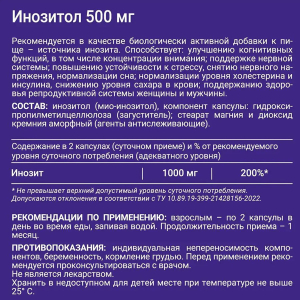 2 капсулы Инозитола от Evalar Laboratory содержат оптимальную суточную дозировку 1000 мг.