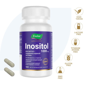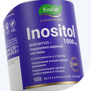 Инозитол от Evalar Laboratory находится в активной мио-форме, что позволяет ему быстрее всасываться и воздействовать на организм на клеточном уровне.