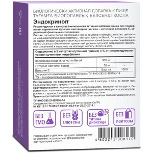 Как принимать, курс приема и дозировкаВзрослым по 2 капсулы 1 раз в день во время еды. Продолжительность приема — 3 месяца. Рекомендуется применять в комплексе с крем-гелем «Эндокринол», который наносится на кожу в области шеи. Таким образом обеспечивается одновременное внутреннее и наружное воздействие, в результате создается оптимальная концентрация биологически активных веществ, необходимых для щитовидки.