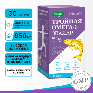Тройная Омега-3 Эвалар – это:- Самая высокая1 дозировка омега-3 в 1 капсуле. Тройная Омега-3 Эвалар содержит 950 мг незаменимых ПНЖК омега-3 (ЭПК + ДГК), вместо 300 мг, как в обычных.