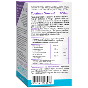 Рекомендуется в качестве биологически активной добавки к пище – дополнительного источника полиненасыщенных жирных кислот омега-3 (эйкозапентаеновой (ЭПК) и докозагексаеновой (ДГК) кислот), в том числе для беременных и кормящих женщин (СоГР). 950 мг – максимум омега-3. Способствует: поддержанию здоровья сердца и сердечно-сосудистой системы; поддержанию уровня холестерина и триглицеридов в норме; поддержанию здоровья суставов; сохранению здоровья глаз; укреплению иммунитета; поддержанию красоты кожи, волос и ногтей; Anti-Age эффекту; сохранению когнитивных функций в пожилом возрасте; улучшению памяти, внимания, способности к обучению (ДС).
