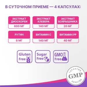 Экстракт диоскореи, компоненты капсулы (пищевые добавки): желатин, оксид железа красный (краситель); аскорбиновая кислота, экстракт клевера, никотиновая кислота (витамин РР), экстракт цветков и листьев боярышника, рутин, диоксид кремния аморфный и стеарат магния (агенты антислеживающие) Противопоказания