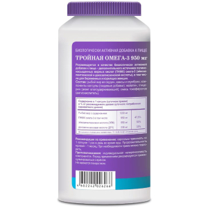 - Самая высокая¹ дозировка омега-3 в 1 капсуле. Тройная Омега-3 Эвалар содержит 950 мг незаменимых ПНЖК омега-3 (ЭПК + ДГК), вместо 300 мг, как в обычных.