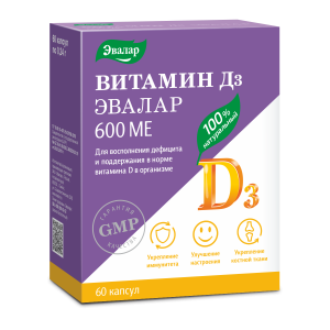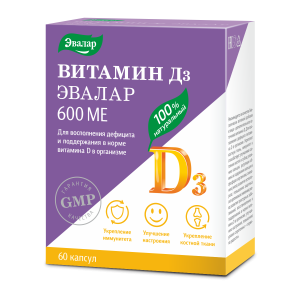 Витамин D3 600 МЕ от Эвалар содержит максимум* витамина D в наиболее усвояемой форме - холекальциферола и помогает эффективно восполнить его дефицит.