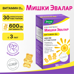 Специально для восполнения недостатка витамина Д3 и поддержания в норме его уровня для детей с 3 лет компания «Эвалар» разработала витаминный препарат Бэби Формула Мишки Витамин Д3 в форме вкусных мармеладных мишек. Каждая пастилка содержит 100% суточной нормы натурального витамина Д3 (также называемого «солнечный витамин») в оптимальной дозировке 400 МЕ.