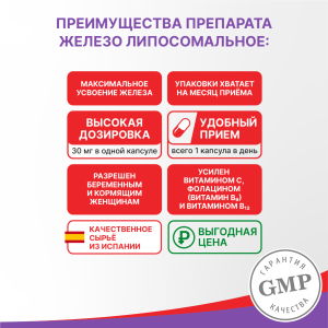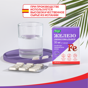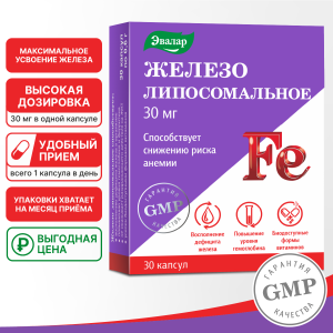 Для высокого усвоения1 железа попробуйте Железо липосомальное от «Эвалар». Препарат представляет собой инновационный легкоусвояемый источник железа в липосомальной форме.