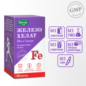 ЖЕЛЕЗО ХЕЛАТ - Биологически активная добавка (БАД) к пище - легкодоступное железо в хелатной форме. Без побочных эффектов со стороны ЖКТ. Активное вещество: Железа аминокислотный хелат (железа бисглицинат), витамин С, витамин В9 (фолат), витамин В12 Действие: Для максимального усвоения железа, поддержания в норме уровня ферритина и гемоглобина Содержание в 1 капсулее (суточном приеме) и % от рекомендуемого уровня суточного потребления (адекватного уровня): Железо (в форме железа бисглицината) 28 мг 200%* Витамин С 30 мг 50% Фолат (Витамин В9) 400 мкг 200%* Витамин В12 8 мкг 800%* Допускаются отклонения в соответствии с ТУ 10.89.19-444-21428156-2022. *Не превышает верхний допустимый уровень суточного потребления. Усталость, сонливость, головокружение, одышка и раздражительность - вам знакомы эти симптомы? Возможно, вашему организму не хватает железа. По данным ВОЗ каждый пятый житель планеты страдает железодефицитной анемией, в той или иной степени. Железо - один из самых важных минералов, необходимых для нашего здоровья. Все ткани и органы человеческого организма функционируют только в присутствии железа. Для максимального усвоения1 железа попробуйте легко усваиваемый хелатный комплекс Железо хелат Эвалар. Железо хелат Эвалар содержит высокую дозировку железа (28 мг в 1 капсуле) и необходимые для лучшего усвоения железа витамины нового поколения в коэнзимных формах (витамин С, В9 и В12). В отличие от обычных, коэнзимным формам витаминов не требуется времени на активацию. Они вступают в реакцию сразу и поэтому могут использоваться организмом быстрее и эффективнее. ЖЕЛЕЗО ХЕЛАТ ЭВАЛАР СПОСОБСТВУЕТ: • поддержанию в норме уровня ферритина и гемоглобина • снижению риска развития анемии • снижению усталости • повышению работоспособности ПРЕИМУЩЕСТВА ЖЕЛЕЗО ХЕЛАТ ЭВАЛАР: 1. хорошо усваивается без побочных эффектов со стороны ЖКТ (не вызывает вздутия, запоров и диареи), так как не влияет на уровень кислотности желудка; 2. высокая дозировка - 28 мг в 1 капсуле 3. состав усилен витаминами нового поколения в коэнзимных формах (витамин С, витамин В9 и В12) для лучшего усвоения 4. удобный приём - всего 1 капсула в день 5. разрешен беременным и кормящим2 КАК РАБОТАЮТ ИНГРЕДИЕНТЫ? Важнейшие функции железа: 1. Участвует в транспортировке кислорода к клеткам, сосудам и тканям, т.к. является важнейшим составляющим элементом гемоглобина3 2. Отвечает за качество иммунного ответа и участвует в процессах тканевого дыхания4 3. Участвует в обменных процессах, разрушает и выводит из организма токсины3 4. Предупреждает развитие анемии4 Для того, чтобы железо попало в клетку и связалось с белком ферритином ему необходимы витамины С, В9 и В12. Ферритин накапливает железо в организме и обеспечивает любую его экстренную потребность, что предупреждает падение уровня гемоглобина и снижает риск развития анемии. Кроме того, витамины С, В9 и В12 участвуют в образовании и созревании эритроцитов. Железо хелат Эвалар - лучший выбор для «железного здоровья»! 1 В ассортименте ЗАО «Эвалар» (высокий процент усвоения за счет хелатной формы). 2 По назначению врача. 3 Поляков В.И. Экзамен на «Homo sapiens II» (От концепции естествознания ХХ века - к естествопониманию).- Москва. Изд-во Академия естествознания. 2008 г. 4 Н.Г.Колосова, Г.Н.Баяндина, Н.Г.Машукова, Н.А.Геппе / Обмен железа в организме и пути коррекции его нарушений / - Кафед
