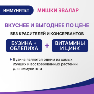 Обратите внимание на современный комплекс для поддержки иммунитета Бэби Формула Мишки Иммунитет от компании «Эвалар». Это первый1витаминный комплекс для детей с экстрактами бузины и листьев облепихи. В комплексе с витаминами D3, С, Е и цинком они способствует естественной активации и поддержке иммунитета, а также снижению риска развития ОРВИ.