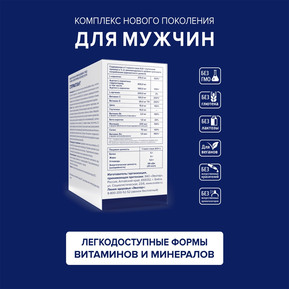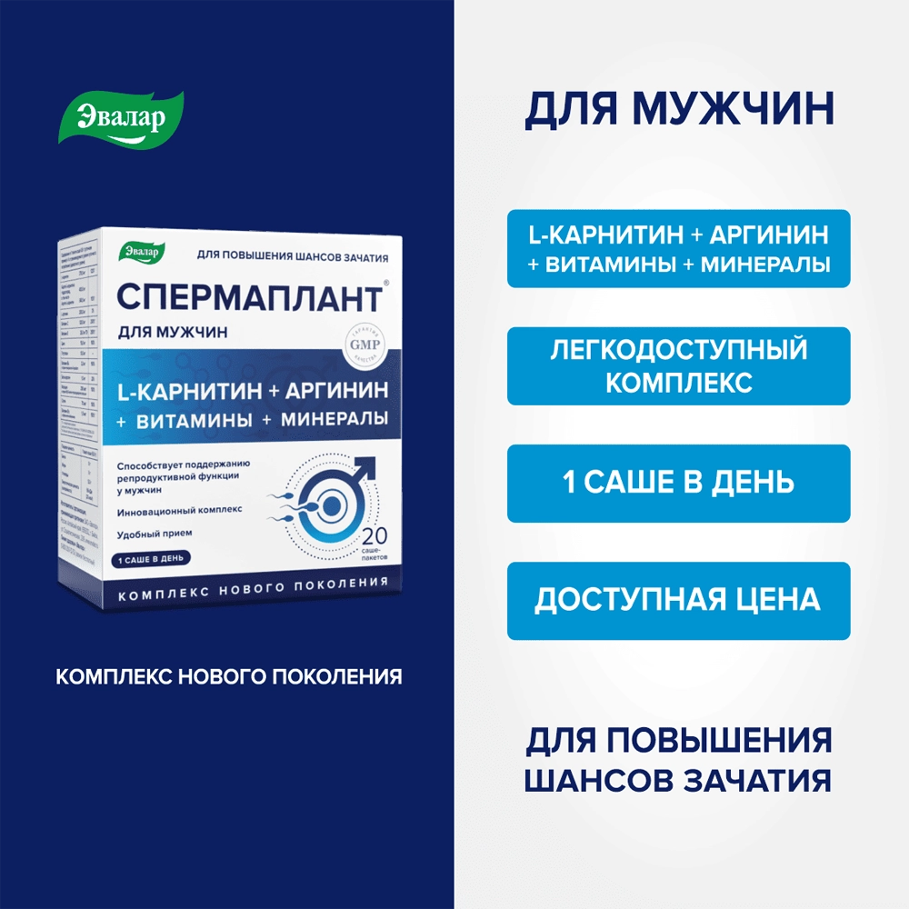 Рекомендуется в качестве биологически активной добавки к пище – источника ацетил-L-карнитина, L-карнитина, бета-каротина, дополнительного источника цинка, селена, витаминов В6, В12, Е и С, фолацина, содержащей глутатион. Содержит аргинин. Входящие в состав компоненты способствуют оптимизации рациона питания мужчин для поддержания репродуктивного здоровья, процесса сперматогенеза; нормализации гормонального фона и либидо, улучшению фертильной функции: здоровому развитию сперматозоидов, улучшению их подвижности и концентрации, их защите от окислительного стресса и повреждений генетического материала, повышению шанса зачатия.