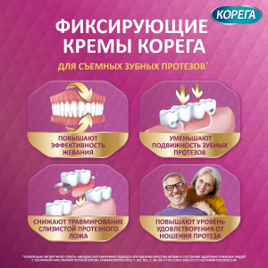 Надежная фиксация зубного протеза придаст вам уверенности и позволит заботиться о более важных вещах. Крем для фиксации зубных протезов Корега Комфорт повышает качество жизни людей, использующих зубные протезы: