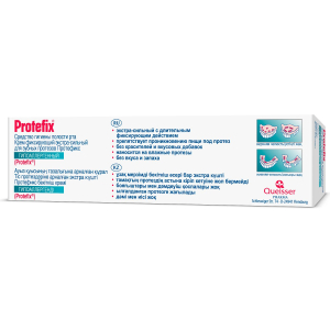 Затем вставить протез и на несколько секунд прижать его к десне. Сильная фиксация возникает практически немедленно и продолжается на протяжении 8-12 часов. Применять только при здоровой слизистой оболочке полости рта! В течение 5 минут после нанесения не следует принимать пищу. Пользуйтесь гипоаллергенным экстра-сильным фиксирующим кремом Protefix® очень экономно, так как передозировка снижает удерживающую способность крема.