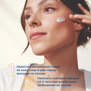 Способ применения и дозыИспользовать после увлажняющего средства или самостоятельно. Обильно и равномерно нанесите на лицо и шею перед выходом на солнце (недостаточное количество продукта снижает уровень защиты от солнца). Подходит для ежедневного использования. Регулярно повторяйте нанесение, также после купания для поддержания защиты. При попадании в глаза немедленно и тщательно промыть. Избегать контакта с одеждой. Для взрослых.