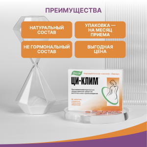 Таблетки Ци-Клим* относятся к негормональным лекарственным средствам – в их составе есть только натуральные фитогормоны, полученные из экстракта цимицифуги, и нет синтезированных гормонов. Используемые в средстве фитогормоны имеют эстрогеноподобное действие, поэтому эффективно восполняют собой недостаток естественных половых гормонов. При правильном применении в рекомендованной дозировке в течение трех месяцев они не вызывают побочных эффектов**, но при этом заметно уменьшают выраженность неприятных симптомов.